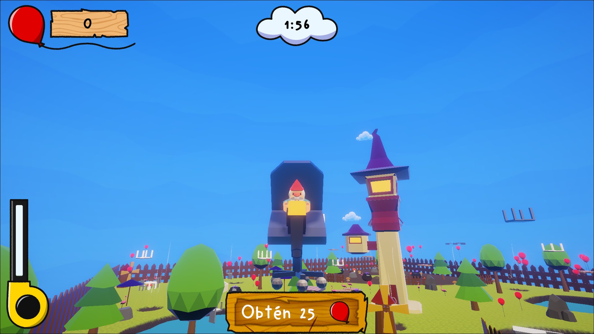 Vuela usando un soplador de hojas y revienta más globos que los demás gnomos.